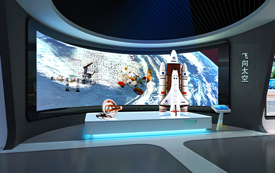 利用多媒體、模型和實物等技術手段再現人類太空探索的圓夢歷程。通過模擬演示和實物展示,使人產生身臨其境的感覺。如利用三維動畫技術,生動地描述火箭發射“神舟”號飛船全演示,把火箭發射飛船和飛船在太空的運行及回收的三個過程,通過聲、光、電、動態模擬,把火箭發射飛船的場景展示得栩栩如生。