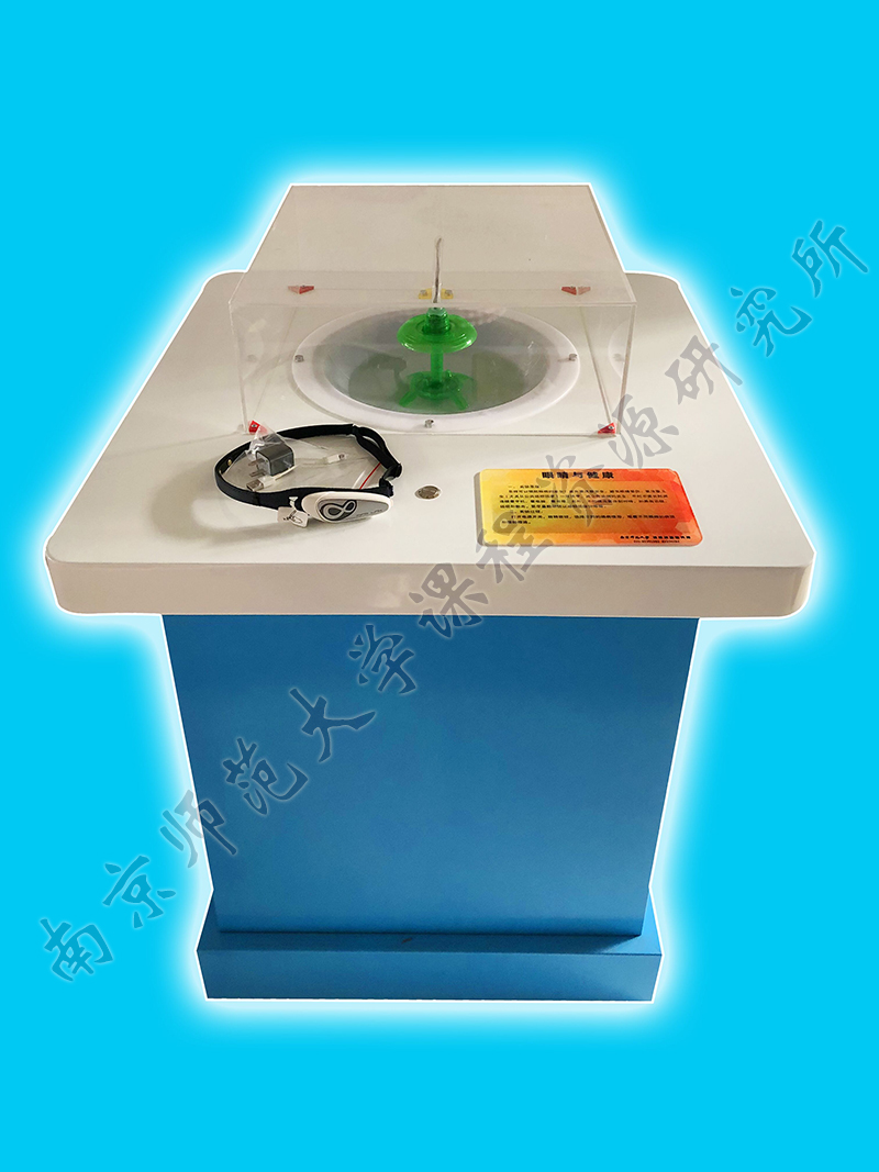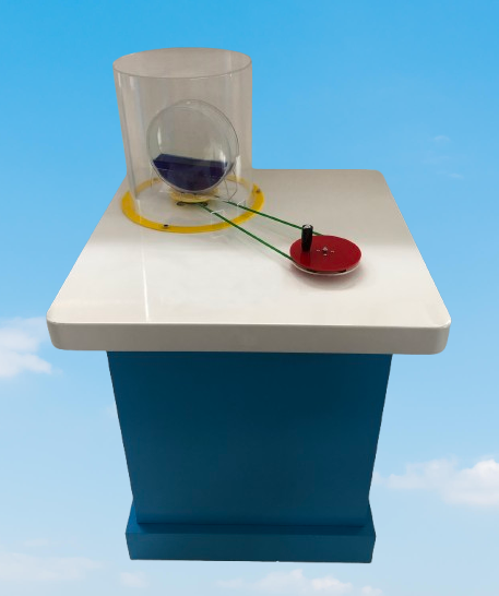 功能概述:此展項由可旋轉(zhuǎn)的轉(zhuǎn)臺、固定在旋轉(zhuǎn)臺上的演示裝置等構(gòu)成。通過互動展示,讓觀眾了解離心現(xiàn)象。觀眾轉(zhuǎn)動手輪驅(qū)動轉(zhuǎn)盤轉(zhuǎn)動,可以發(fā)現(xiàn)由于離心力的作用,透明水箱中的液面發(fā)生了變化,中間低兩頭高。