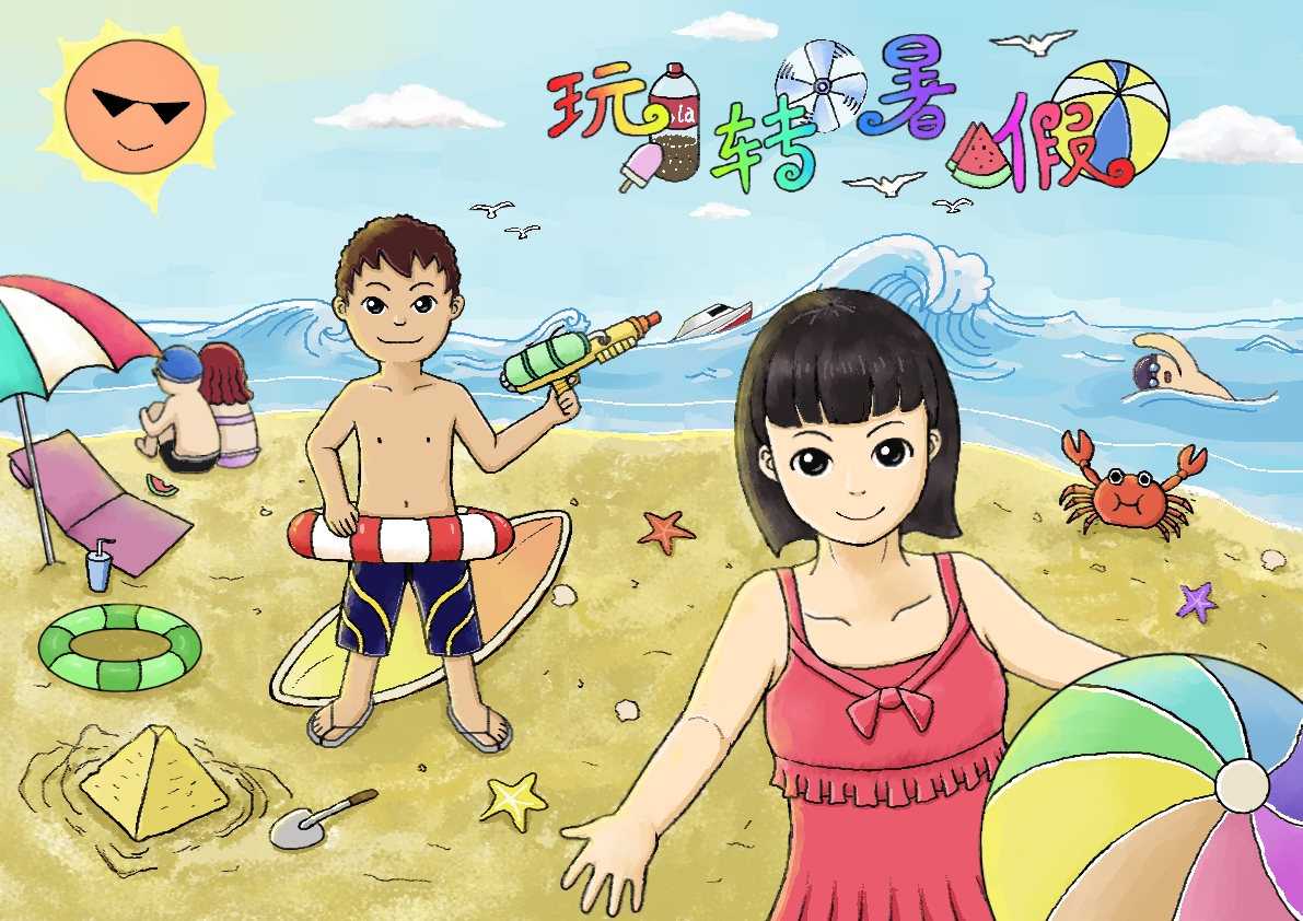暑假到了,假期準備如何度過呢?去海灘游玩是一個不錯的選擇。現在來嘗試創作一幅“玩轉暑假”的作品吧!