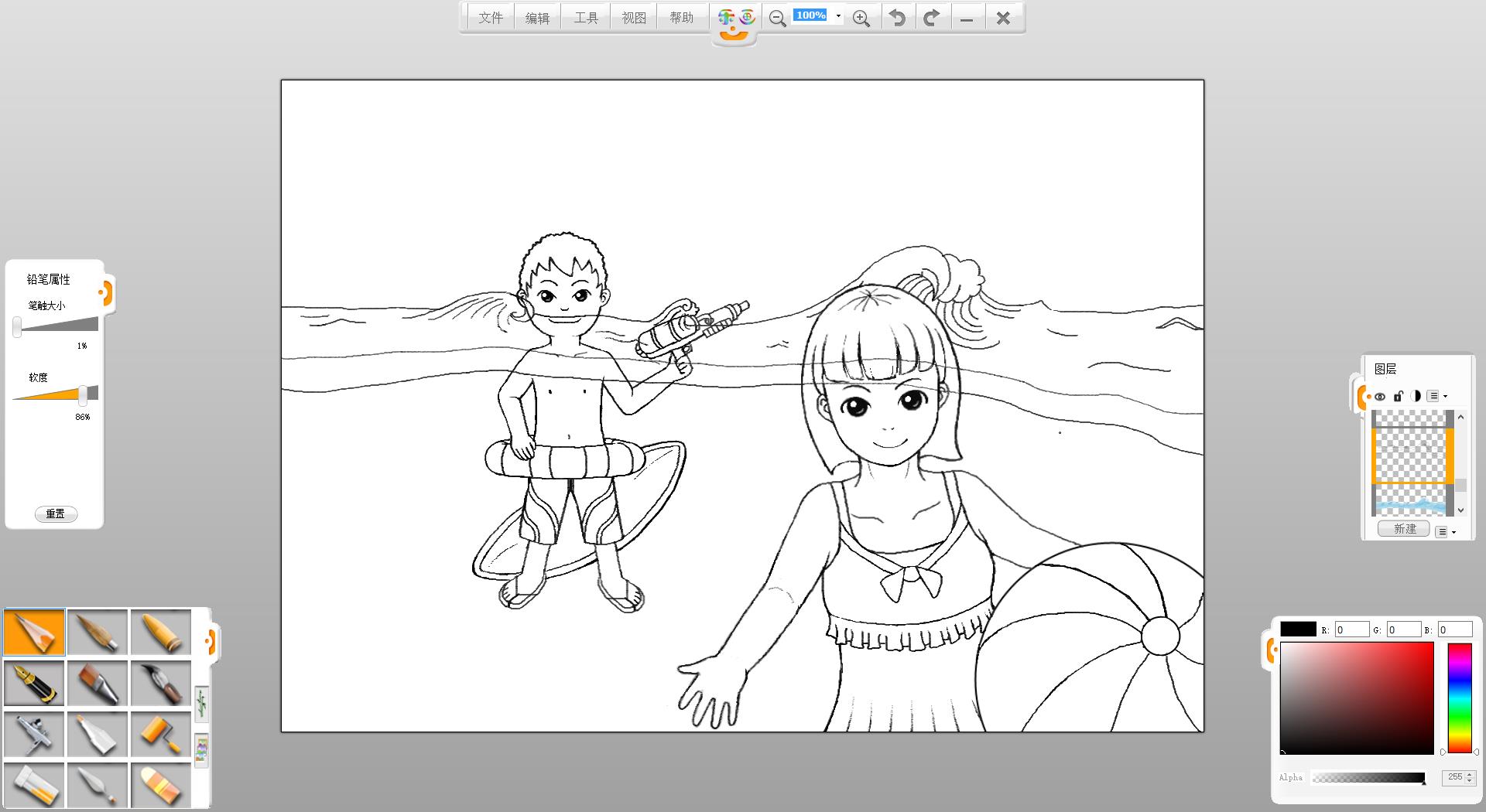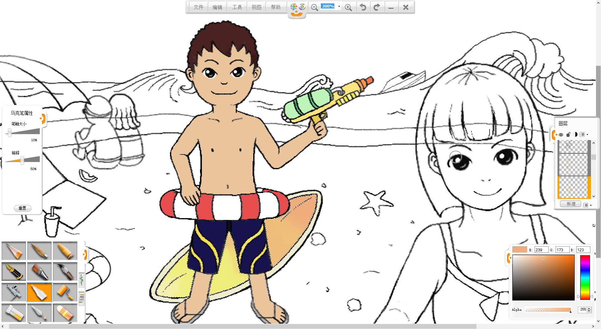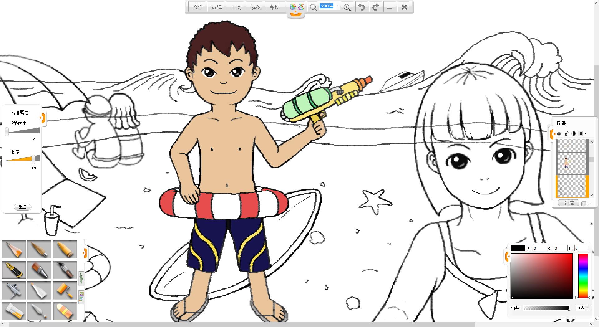 4.使用鉛筆筆觸繪制一個拿水槍的泳裝男孩形象。