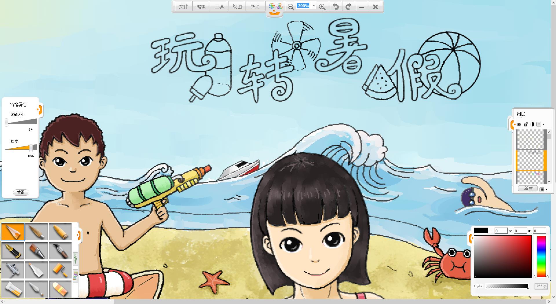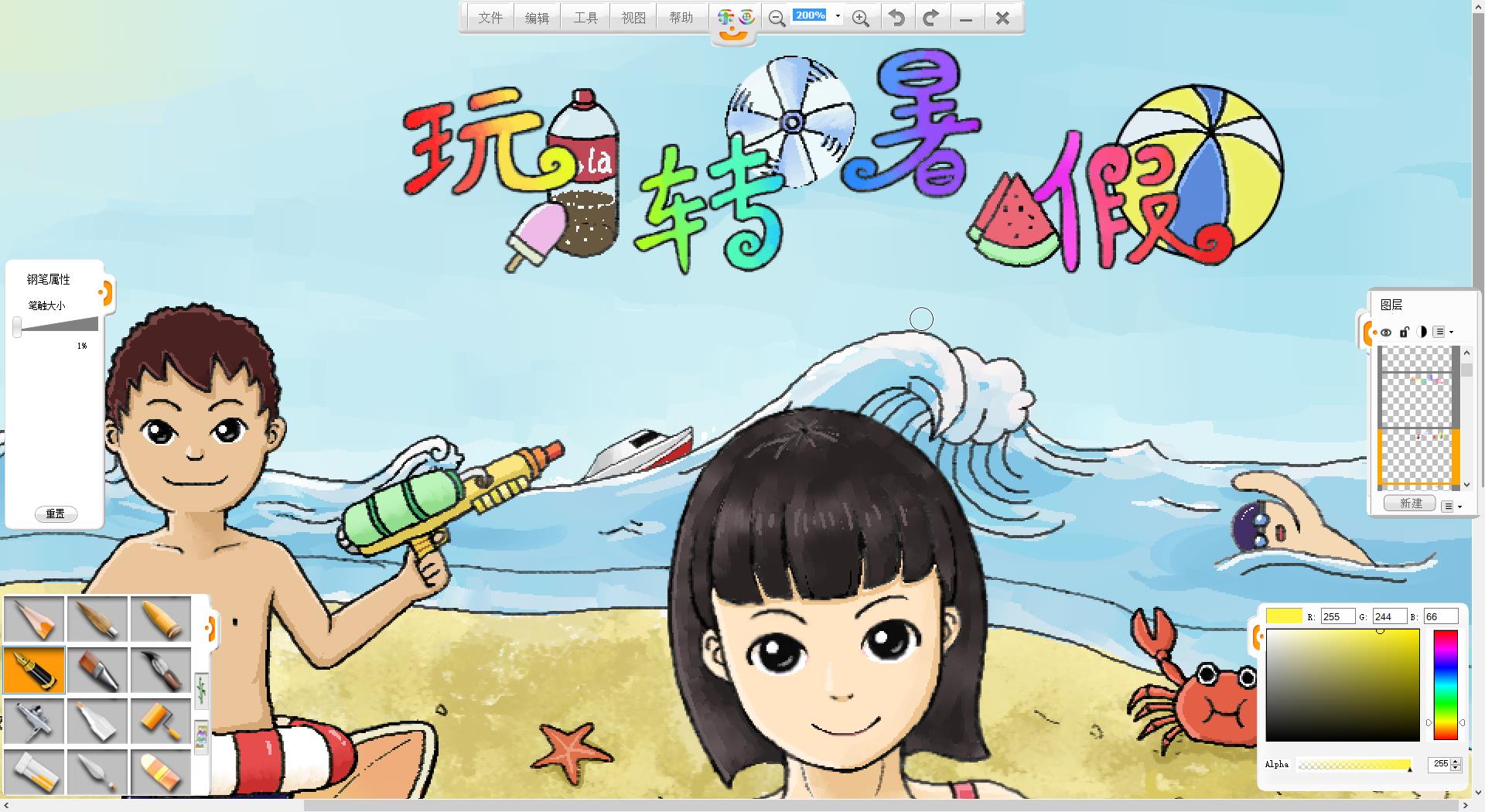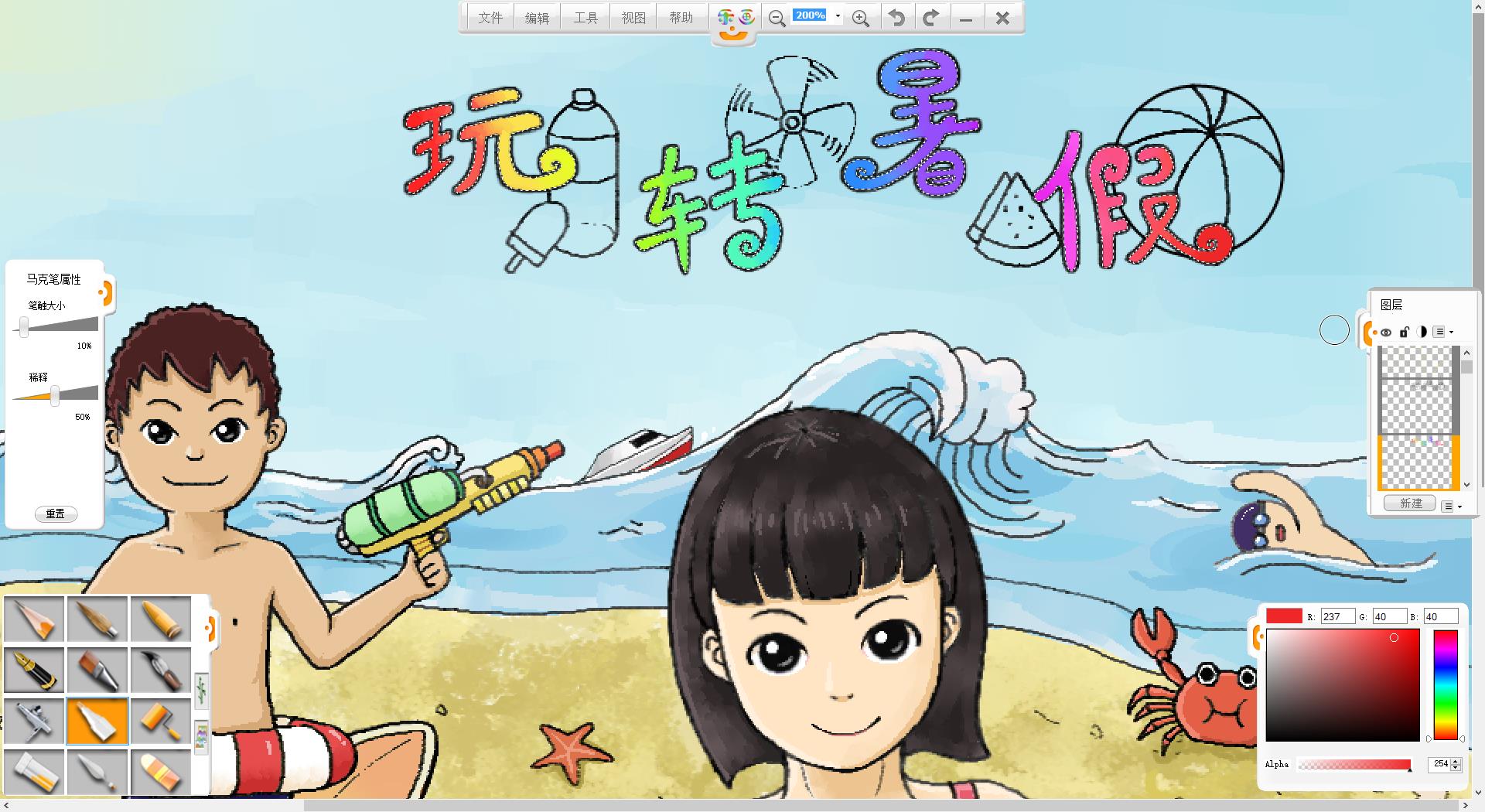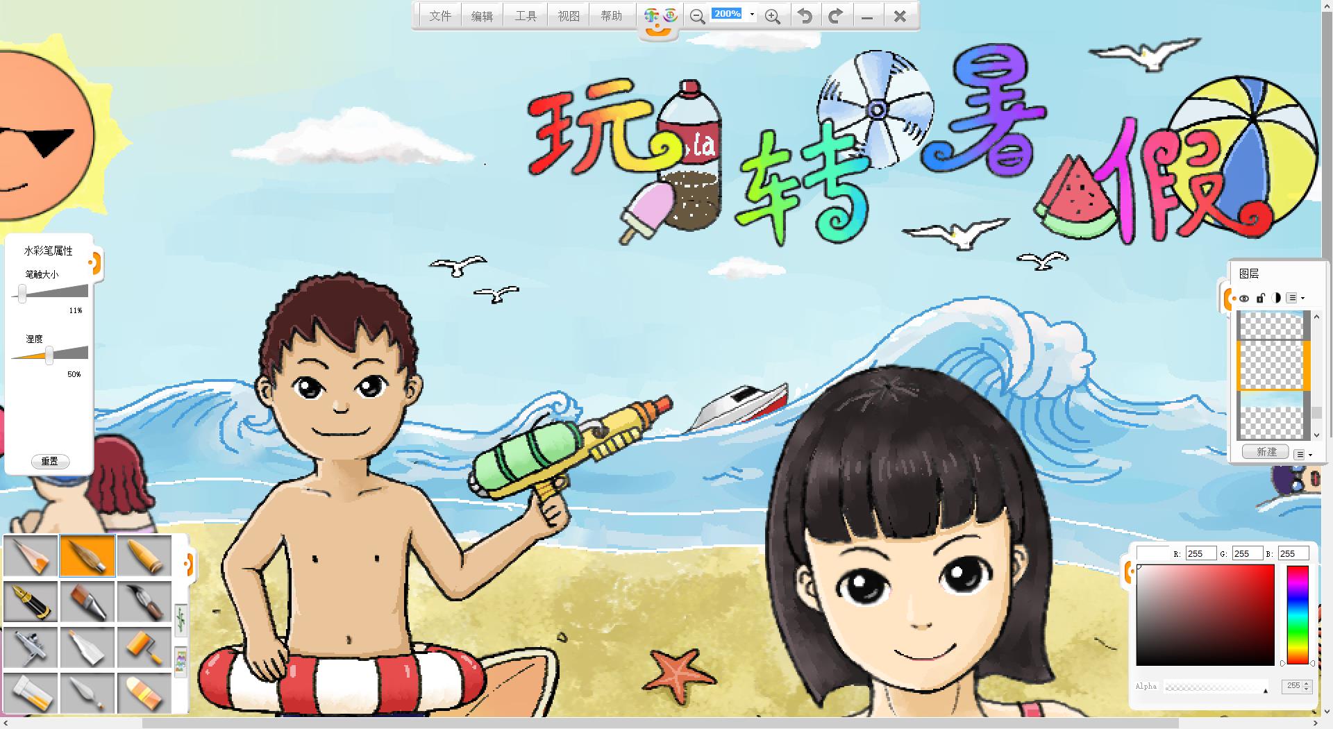 26.一幅“玩轉暑假”的作品創作完成了,如果有時間還可以給人物更換不同的發型和服裝。