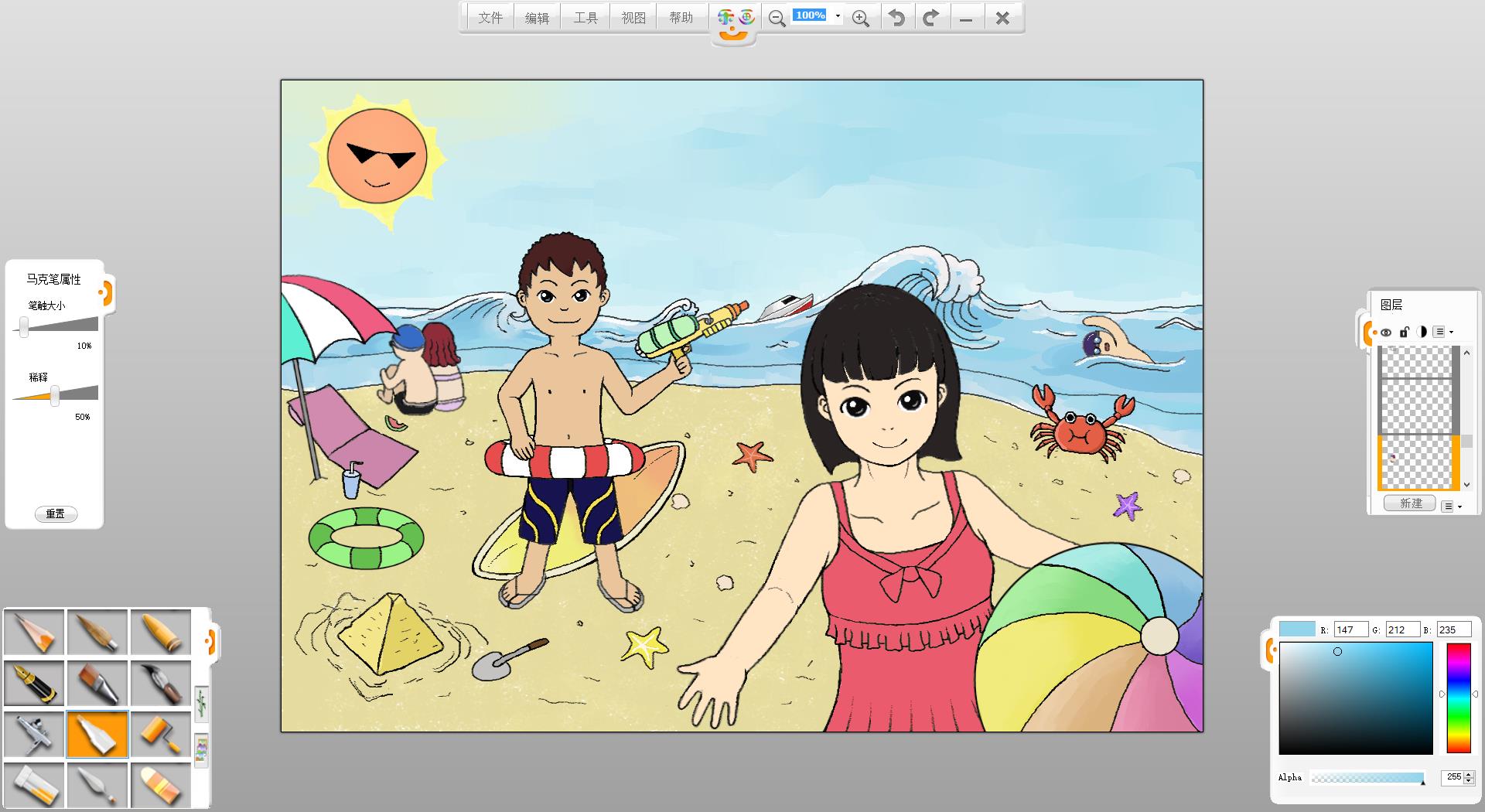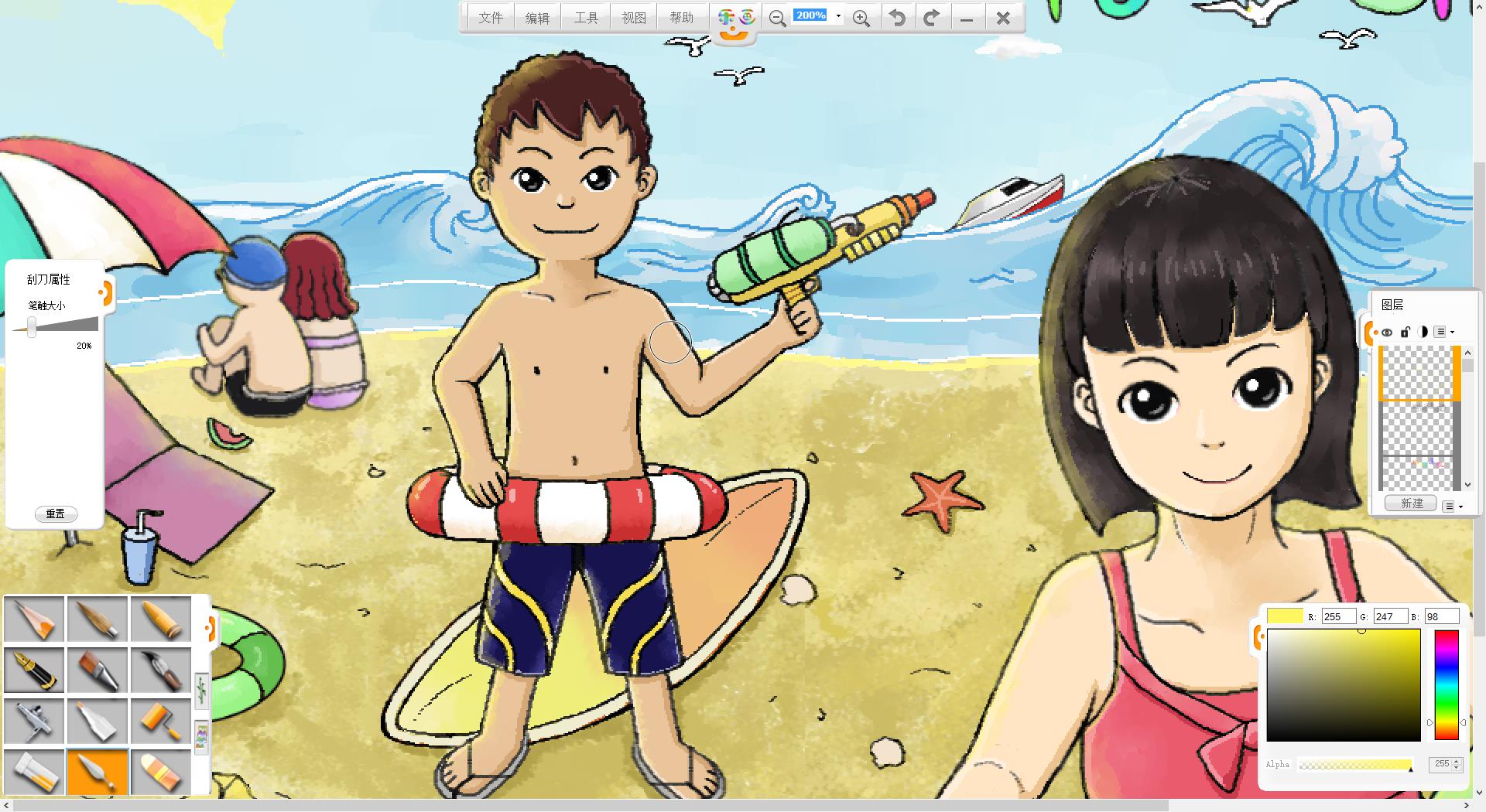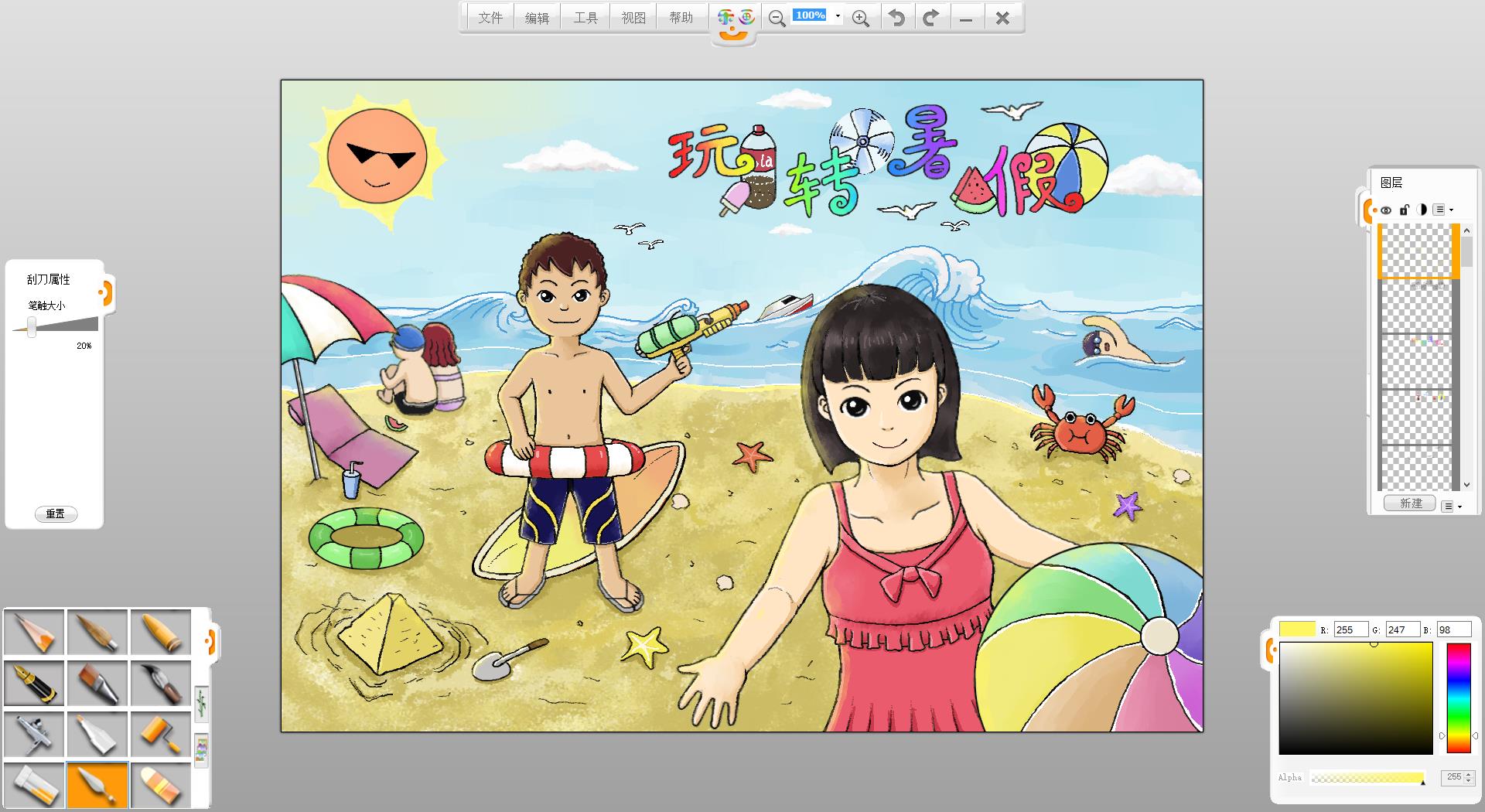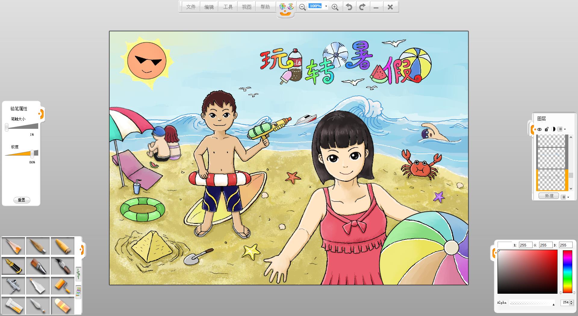 26.一幅“玩轉暑假”的作品創作完成了,如果有時間還可以給人物更換不同的發型和服裝。