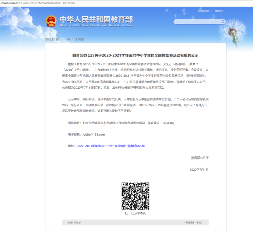 根據《教育部辦公廳印發<關于面向中小學生的全國性競賽活動管理辦法(試行)>的通知》(教基廳〔20189號)精神,由主辦單位自主申報,經組織專家進行形式審核、通訊評審、業務范圍評審、會議評審,擬確定中國青少年機器人競賽等35項競賽為2020-2021學年面向中小學生開展的全國性競賽活動,舉辦時間原則上為20218月前;人員聚集的競賽具體舉辦時,主辦單位須報舉辦地疫情防控部門同意。現就相關信息予以公示,公示期為202071日至7日。至此,2019年公布的競賽項目舉辦周期已完結。