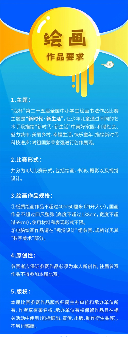 由教育部辦公廳發文公布,由中國兒童中心主辦,中國美術家協會協辦的全國中小學生繪畫書法作品比賽創辦于1995年,是經教育部批準的面向小學到高中各年齡段青少年兒童的,有著廣泛影響力的青少年素質教育活動。比賽至今已經舉辦二十四屆,全國參賽學生累計達到一千多萬人次,遍及全國三十余個省、市、自治區、直轄市,2019年覆蓋到了港澳臺及海外華人地區,是一項有著廣泛影響力的重要藝術比賽活動,也是教育部唯一保留下來具有引領性的大型藝術類教育比賽活動。這一比賽活動最大的特色是面向全國(包括港、澳、臺)以及海外華人、華僑青少年兒童征集書畫作品。在80個城市設有大賽集體組織單位,大賽分為少年組(12-17周歲)、兒童組(7-11周歲)、幼兒組(7周歲以下),每屆參賽者近五十萬,每屆大賽持續時間貫穿全年。組委會也將邀請著名藝術教育專家及優秀美術教育者對作品進行評審后頒發獲獎證書。該比賽活動對于普及少年兒童美術教育,促進少年兒童全面發展起到了良好的作用。
