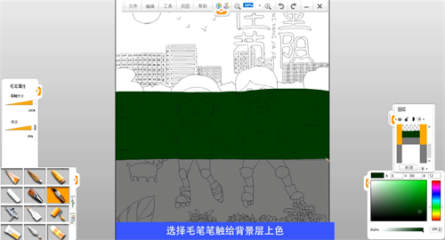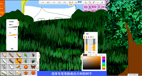 選擇小草筆觸畫出背景的草地,選擇樹葉筆觸畫出背景的大樹樹冠