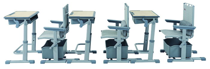 6、課桌椅午休模式:課桌通過兩側按鍵調節到最低高度,并將桌面向前下方折疊固定,課椅靠背向后調節,借助桌上和椅下空間,可在1米前后間距實現150度原位舒適躺休。