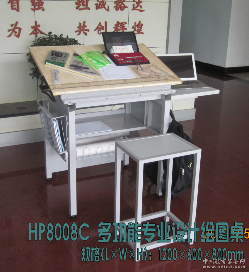 產品詳細介紹規格(L×W×H):1200×600×800mm (標配三聚氰胺桌面) 結構技術參數: 整體采用全鋼結構,標配主桌面采用厚度2.5cm的80×60cmE1環保楓木色三聚氰胺板桌面基板; 下雙側采用“惠普”繪圖專用傾角調節鉸鏈,經久耐用,保證桌面平整、同步控制調節傾斜度調節0-80°;桌面板下端筆槽邊高出桌面折邊可擋住1、2號繪圖板或者丁字尺等物品; 桌子右邊采用“惠普”專利折疊結構的副桌面板(E1國標的25mm三聚氰胺板400×550mm),滿足教學和繪圖作業配套放置電腦、文具、書籍等需求;不使用時可以下掛節省空間; 桌體右邊設置有掛鉤,可以掛放書包等物品; 桌體左邊為儲物鋼制書籍婁,可放置書籍、文具等; 主桌面下面和支架中部配置有二處鋼制儲物廂,可以放置書包、文具等; 下部為放置繪圖紙的圖紙的鋼婁; 桌體背部設置有放置1號或者2號繪圖板的機構,方便存放繪圖板; 桌腿支架底部采用塑膠木調整螺絲,便于調節水平等功能,保證整體結構的堅固、穩定; 整體設計科學、合理、實用和耐用,適合于工程制圖繪圖和繪畫專業的多種學科,在院校內實用和功能齊全的一款多功能繪圖桌,有較強的多種行業和課程的兼容性和普及性。 |