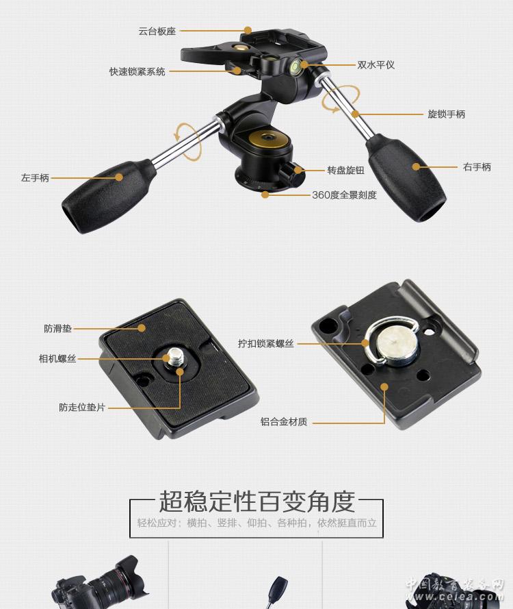 產品詳細介紹 維特利38H是一款雙手柄式三維云臺,能同時左右手并用,標準3/8英寸螺孔,適合與任何一款專業三腳架配搭;采用鋁合金材質,堅固耐用;添加阻尼油,在攝像過程中得到很好的緩沖效果,手感舒適恰當; 帶有全景刻度轉盤,可實現360°水平全景接片拍攝;萬向角度的三腳架云臺,帶來全新的攝影攝像體驗,特殊研發的鎖緊結構,能比市面上多數云臺操作時間節省一半,一撥即可彈出相機變換手捧模式,一按即可連接三腳架主體,非常適合商業攝影師使用; 我廠承接三腳架云臺OEM貼牌代工,一件代發,小額批發等,歡迎咨詢!
