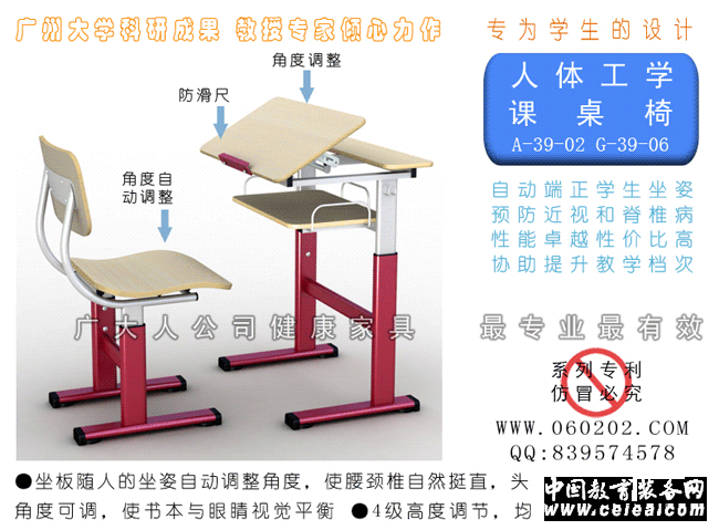 人體工學課桌椅 預防近視眼和脊椎病 ·坐板隨人的坐姿自動調整角度,使腰頸椎自然挺直,頭部自然抬高,眼睛與桌面保持距離。 ·桌板角度可調,使書本與眼睛視覺平行。 ·四級高度調節均采用最新國家標準。 HUMAN ENGINGEERING FITMENT Protect students from myopia and backboneillness effectiveely ·The angle of the desk can be adjust, which make your eyes against book directly. ·Seat angle can be adjust automatically,draw yourself up.