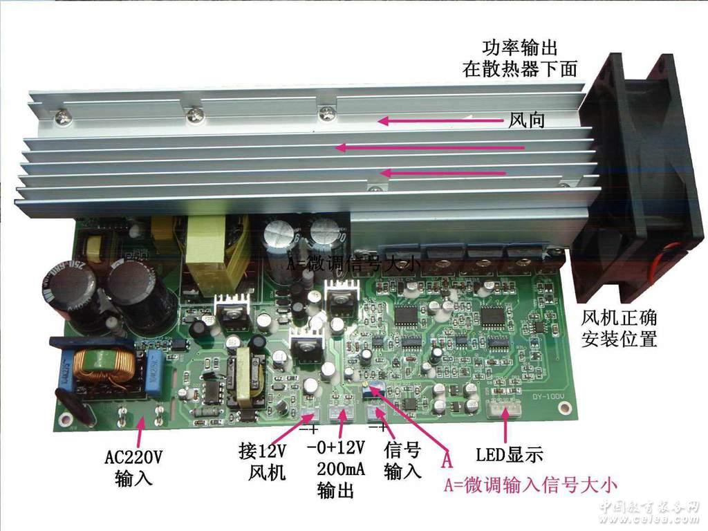 輸入、輸出接口: 工作狀態LED顯示接口 用于顯示工作、信號、自動保護狀態指示。 12V200mA風機電源輸出 用于外接散熱風機 + - 12V 200mA輸出 用于您或許需要配套的前級板電源. 智能風機控制: 當散熱器溫度上升到50度時,風機開始工作。低于50度時,風機停止工作。