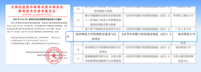 2025年11月16日,教育部教育信息化技術(shù)標(biāo)準(zhǔn)委員會(CELTSC)全體會議在三亞召開。會上,30項“2025年CELTSC標(biāo)準(zhǔn)創(chuàng)新與應(yīng)用優(yōu)秀案例”獲表彰和頒獎,《南京師范大學(xué)智慧教室建設(shè)與應(yīng)用項目》成功入選,成為高校數(shù)智化建設(shè)的典型實踐。