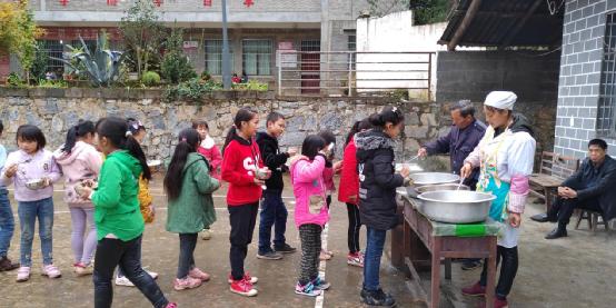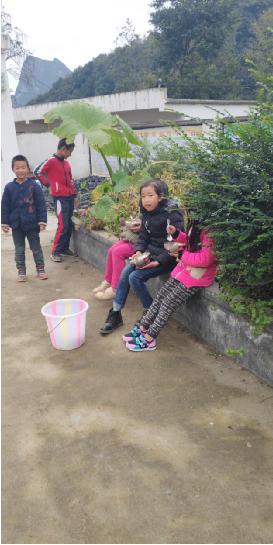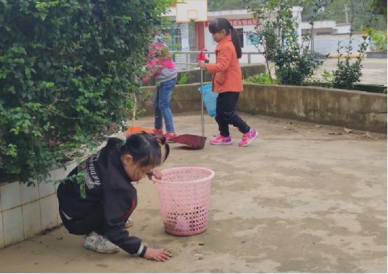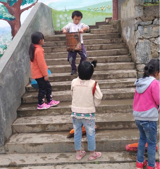 不一會兒孩子們上午的課程就結束了,因為孩子們離家比較遠,所以都會在學校吃午飯。那天剛好是一周一次的大掃除日,孩子們需要先清潔校園,然后才吃午飯。一個個比掃帚矮一大截的小朋友,沒人指揮、沒人監督,都自覺認真地清掃校園,當天的溫度在10度左右,我穿著羽絨服幫忙掃樹葉都覺得冷冷的,可是有的小朋友就穿了一兩件單薄的衣服,流著鼻涕,小手凍的紅紅的,還在地上撿樹葉、掃樓梯、擦門窗。看著一個個忙碌的小身影,我很心痛,到底是怎樣一種生活環境,才讓他們有著這般和年紀不符的成熟懂事啊。