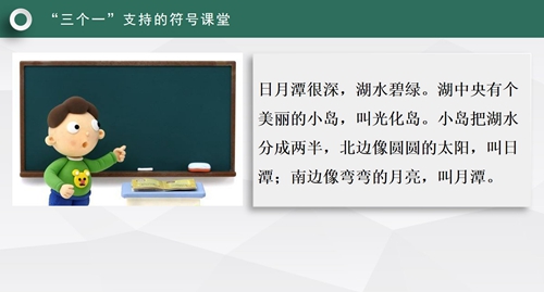 我們老師現在教學借助這樣的一張照片,我們老師可以帶著學生結合剛才的文本,在老師的引領下學生借助多媒體直觀的地圖照片,孩子就能理解日月潭為什么叫做日月潭。