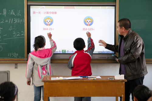 (公地鄉(xiāng)小學,老師指導孩子在一體機互動)