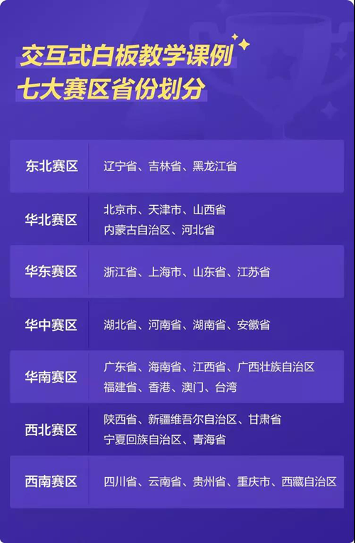 當教師選擇【交互式白板教學課例】類型參賽,即使用希沃白板工具進行說課時,組委會將根據參賽選手所屬的區域進行劃分評選。共劃分為以下七大賽區: