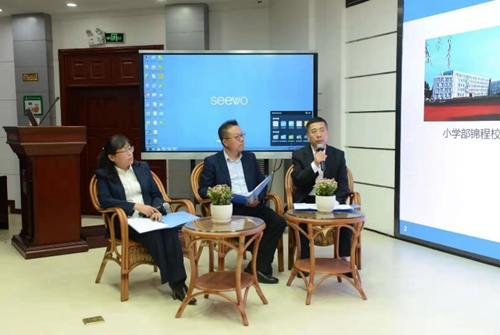 在汽開區(qū)進(jìn)修學(xué)校趙越副校長的主持下,校長團(tuán)隊展示了“聚焦整校推進(jìn)尋求破解之道”主題論壇。第九中學(xué)李旦峰校長分享了立足于頂層設(shè)計,破解了2.0提升工程與學(xué)校整體規(guī)劃如何有機(jī)結(jié)合的問題;第七小學(xué)鐘梅校長、第十二小學(xué)王安巍校長分別從研修模式重構(gòu)、研修方式重塑兩個維度談如何將2.0提升工程工程的實(shí)施與校本研修融合為一體的思考與策略;實(shí)驗學(xué)校周國兵校長、第一中學(xué)尤君志校長分享了基于學(xué)校教師隊伍年齡偏大,如何破解老教師參與到2.0提升工程與技術(shù)應(yīng)用的問題。其中均提到希沃對于學(xué)校信息化建設(shè)。