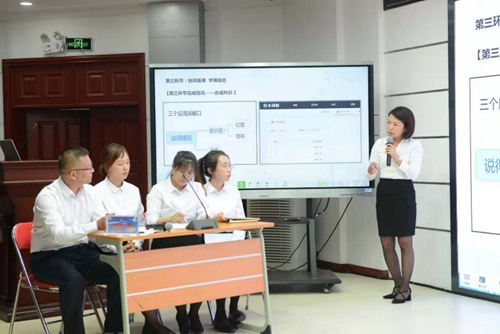 汽開區(qū)第十三小學(xué)語文團(tuán)隊現(xiàn)場展示了基于信息技術(shù)支撐下的校本研修。研修采用了翻轉(zhuǎn)式、線上線下相融合的方式,圍繞如何引領(lǐng)孩子說得精彩的核心問題,破解了教育教學(xué)中的實(shí)際問題,同步提升了教師的學(xué)科專業(yè)素養(yǎng)和信息技術(shù)應(yīng)用能力,提供了一個信息技術(shù)應(yīng)用能力提升工程與校本研修相融合的現(xiàn)場案例。其中教師匯報討論應(yīng)用的軟件為希沃白板5,利用了思維導(dǎo)圖以及板中板等功能實(shí)現(xiàn)歸納總結(jié),并應(yīng)用了希沃授課助手進(jìn)行同屏互傳,遠(yuǎn)程操控。