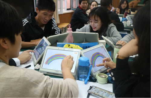 隨后,她在場的教師們下發了小組協作任務,以畫彩虹的方式體驗希沃易課堂功能。畫作展示過程中笑聲不斷,她在最后總結到:“假如學生也能在這種輕松的氛圍中共同完成小組協作任務,不僅效率高,還能鍛煉學生的合作意識。”