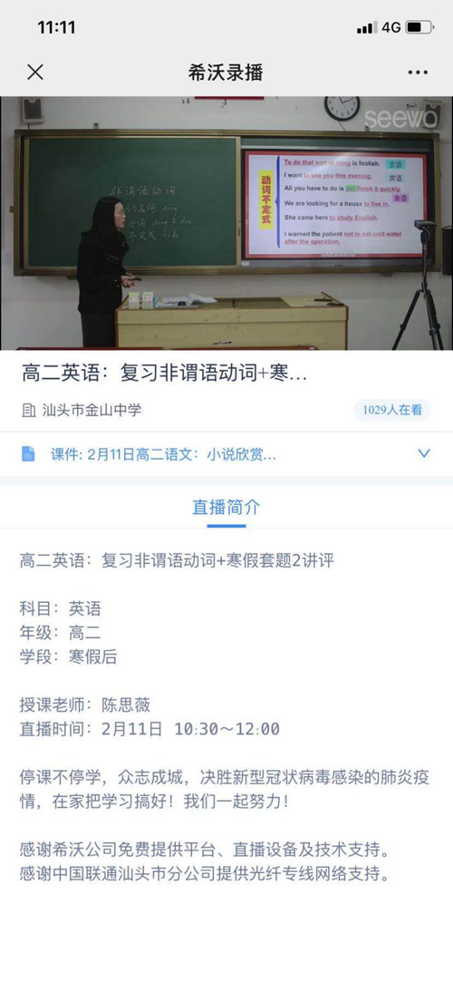 ,廣東省一級中學,為廣東省17所省重點中學之一。該校于2007年10月通過驗收成為廣東省國家級示范性普通高中。當“停課不停學”的精神下達,學校立即啟動了與希沃團隊的合作。在開學前,老師們通過希沃云課堂的功能協助下,進行了集體籌備,開學后利用希沃錄播平臺進行直播,由各學科優秀教師為全校同學進行授課。自2月10日開課,三個年級累計進行了近百節網絡課。