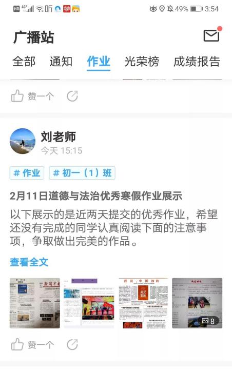 老師們利用希沃白板5中的知識膠囊制作作業講解視頻,分享給學生。因疫情之故,部分學生不能按原計劃完成寒假作業,歷史史向東老師及時調整了寒假作業方案,將外出參觀改成觀看相關的紀錄片,然后做成手抄報,拍照上傳到班級優化大師的作業里。