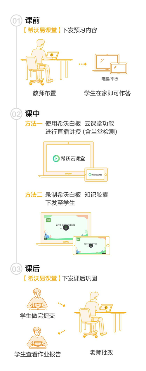 在直播及微課的基礎上,希沃易課堂線上教學方案加入了布置練習的環節,為學校免費開放希沃易課堂的教師空間和學生空間,老師用網頁布置練習,學生用網頁來答題,老師即可看到學生的課前、課后的練習報告、數據分析。方案圍繞課前、課中、課后,保障完整的學習閉環均能通過線上完成。