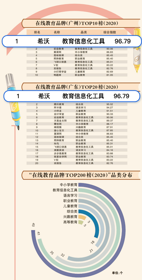 近日,廣州日報數據和數字化研究院(GDI智庫)發布了《在線教育品牌TOP200榜(2020)》(以下簡稱《榜單》)�!栋駟巍凤@示,希沃憑過硬實力與優質服務分別斬獲2020“在線教育品牌榜教育信息化工具品類第一”、“在線教育品牌(廣東)榜第一”、在線教育品牌(廣州)榜第一”、“在線教育品牌榜第五”(多品類)*。