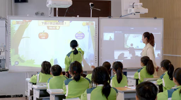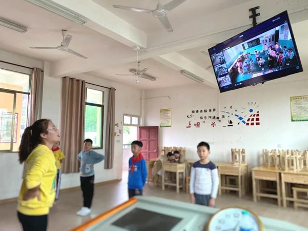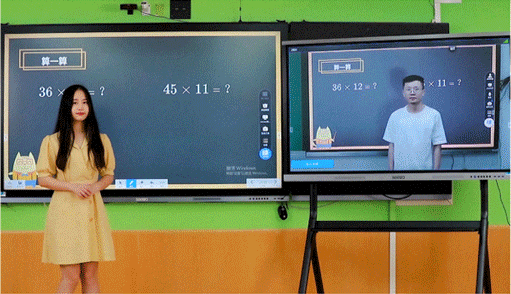 如今,老師在一體機(jī),就可以給兩地展開(kāi)直播啟動(dòng)、同步游戲、同步書(shū)寫(xiě)等操作。