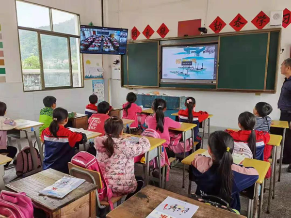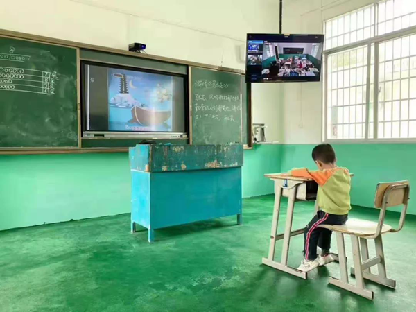 照片來(lái)自江西省興國(guó)縣,教學(xué)點(diǎn)學(xué)生正通過(guò)希沃交互智能錄播(下稱「希沃錄播」),參與中心校的一堂課。