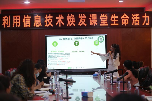 隨后,宜賓市第六中學涂萬敏老師帶來了智慧課堂《一顆小桃樹》。她通過運用希沃易課堂的相關功能,把課前預習、課堂活動、反思提升等環節有機整合起來,并設計互動游戲環節來進行教學,實現了良好的師生互動和生生互動,激發了學生學習的興趣和積極性,有效地提升了課堂效率,贏得了大家的一致好評。