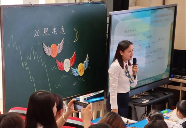 現(xiàn)場(chǎng)所有參賽老師都使用了希沃的信息化教學(xué)軟件——希沃白板及班級(jí)優(yōu)化大師輔助課堂教學(xué)。瀘州市梓橦路小學(xué)校桂秋瓊老師喜獲特等獎(jiǎng),桂老師執(zhí)教的是部編版小學(xué)語文三年級(jí)下冊(cè)的《肥皂泡》一課,通過抓關(guān)鍵詞理解難懂的句子。本堂課信息化教學(xué)應(yīng)用巧妙,借助希沃中的課堂活動(dòng)激發(fā)學(xué)生學(xué)習(xí)的興趣,自制教學(xué)視頻實(shí)現(xiàn)課堂與生活的有效連接,同步課堂實(shí)現(xiàn)了兩校師生同時(shí)在線學(xué)習(xí)。全市小學(xué)教師代表大約共計(jì)600人次聽課觀摩。