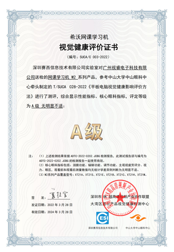 4月13日上市的希沃網課學習機W2,依據中山大學中山眼科中心牽頭制定的T/SUCA 028-2022《平板電腦視覺健康影響評價方法》,經過深圳賽西信息技術有限公司實驗室測評,獲得視覺健康影響A級評定,標志希沃網課學習機W2在觀看舒適度上達到了“高標準”的視覺體驗。