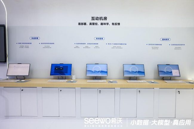 統機房教學場景中需部署設備多、維護成本大、教師管理難度高等難題,希沃在本屆展會上帶來了全新的校園機房解決方案,并展出專為教師辦公設計的希沃一體式教學終端A24,提高教師備授課和辦公效率。