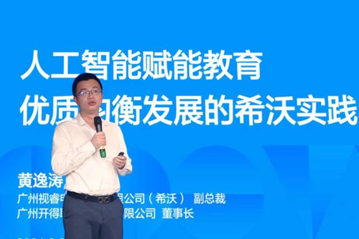 廣州視睿電子科技有限公司(希沃)副總裁、廣州開得聯智能科技有限公司董事長黃逸濤出席此次活動,并圍繞希沃通過人工智能賦能教育優質均衡發展的探索與實踐進行分享。