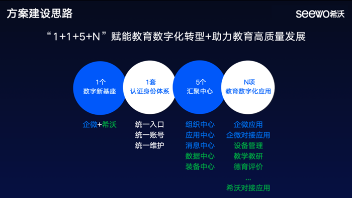 此次合作,希沃魔方與企業微信基于希沃魔方·數字基座的全景架構,結合希沃在硬件終端、教育應用及數據平臺的建設基礎,以及希沃魔方和企業微信優秀的第三方開放能力,總結出“1+1+5+N”的數字基座構建思路。即對端口、身份及組織架構進行統一,構建完整的應用中心整合體系,為用戶提供教育全場景應用,實現了數字基座的整體構建,助力推動數字技術全面賦能教育生態系統的進程。