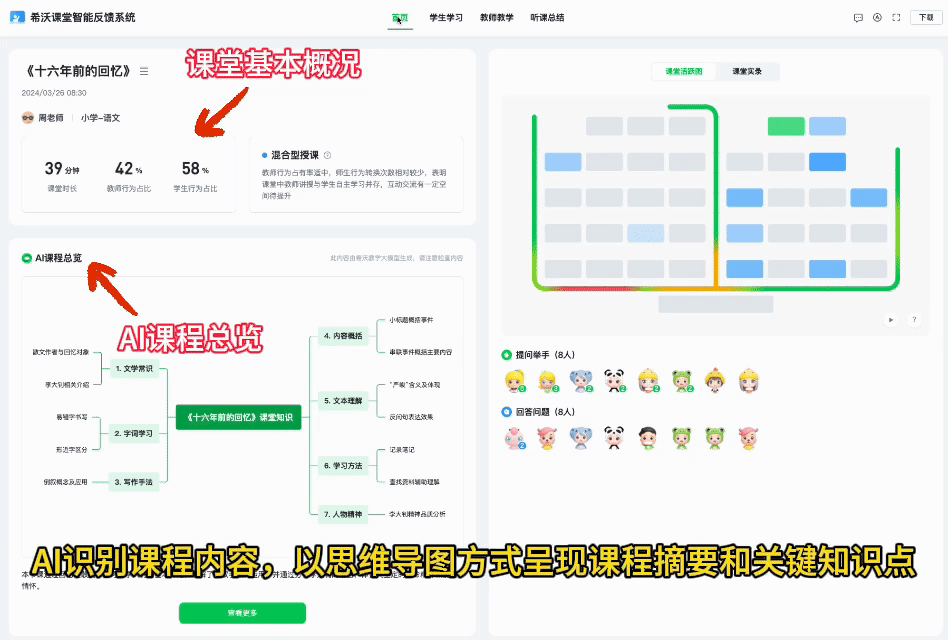 在學生學習維度,通過對抬頭率、舉手率以及參與度等學情數據的回顧,客觀呈現出學生的課堂互動情況與參與度,為教師優化授課行為提供有力參考。同時,還會呈現課堂內容比,以思維導圖形式直觀展示教師授課邏輯和框架,梳理知識內容的關聯,輔助教師了解課堂細節。