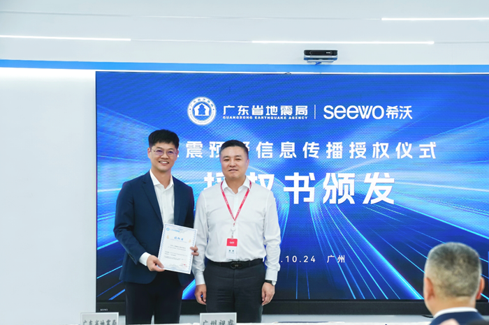 隨后,廣東省地震局正式向希沃頒發“地震預警信息傳播”授權書。此次授權是廣東省地震局首次向第三方機構頒發地震預警信息傳播授權書,標志全國首個基于教室交互智能平板的地震預警系統正式投入應用,雙方攜手為校園安全構筑一道即時、可靠的數字化屏障。