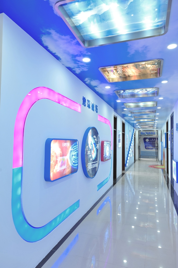樓道主體設計思路:從宏觀到微觀運用現代裝修手段,為師生探究地球環境及地球生物的進化過程提供有效素材。頂部藍天白云和24個世界著名地質地貌景觀燈箱有機組合。兼顧照明作用的同時營造天地合一的神秘感,激發獵奇興趣和探究欲望。頂部選用深邃的藍色襯托點點繁星,淡淡的銀河若隱若現,黃道12星座有序排列,側墻上天體演化過程歷歷在目,濃縮地球的宇宙環境,令人產生無限的遐想。