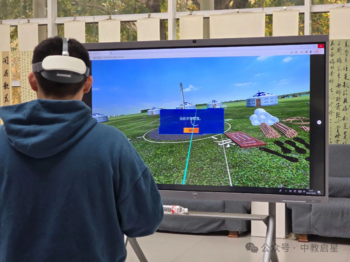 下圖學生體驗的設備是中教啟星地理VR研學系統,這是一款基于VR技術的虛擬研學體驗互動產品。依據地理新課標,落實地理核心素養而全新開發的沉浸式教學系統。本系統創設跨時空3D沉浸式研學情境,讓學生在情境學習中認識地貌,在研學過程中培養地理實踐力,致力打造情境教學的腳手架。