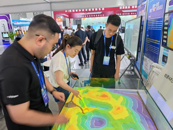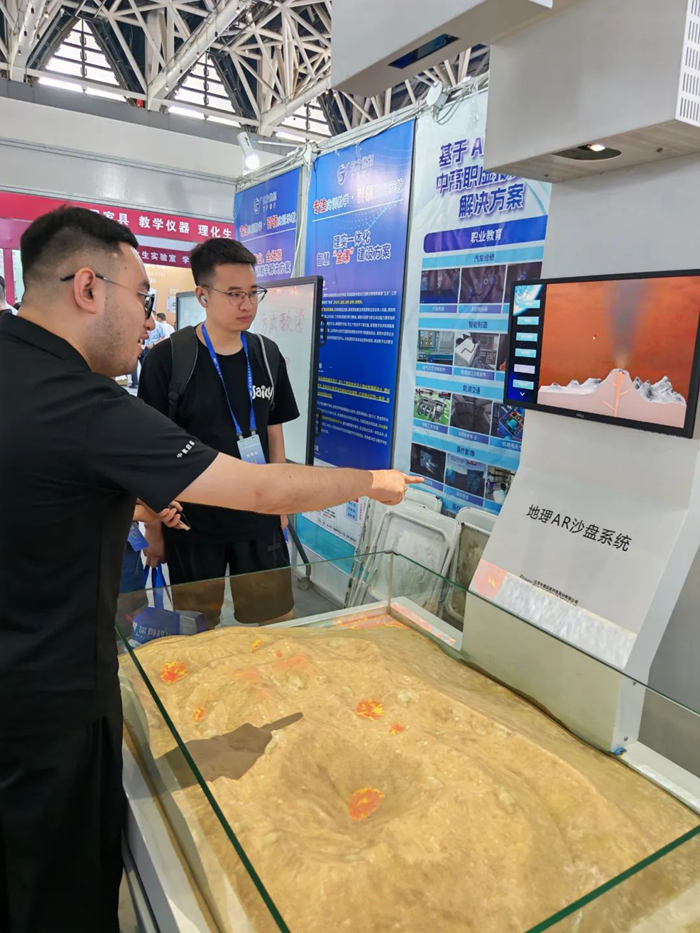 地理 AR 沙盤則是另一大亮點(diǎn),通過先進(jìn)的 AR 增強(qiáng)現(xiàn)實(shí)與傳感技術(shù),學(xué)生只需輕輕操作沙盤,即可實(shí)時(shí)看到地形地貌的動(dòng)態(tài)變化,同步理解相關(guān)等高線地形圖的平面轉(zhuǎn)化,直觀感受等高線、火山噴發(fā)、分層設(shè)色地形圖等抽象地理概念,讓學(xué)習(xí)變得更加生動(dòng)有趣。