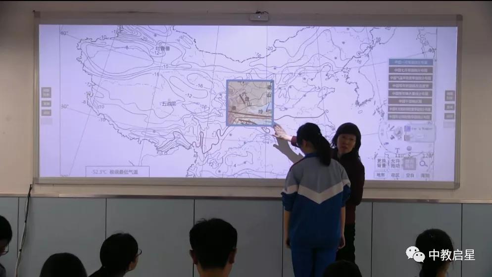 中教啟星交互地圖教學系統是專為現代信息化地理教室而設計的數字化現代教育裝備產品。本系統為凸顯地圖在地理課堂教學中突出地位和功能而潛心設計制作,它將數字專題地圖與教學課件有機結合,通過超寬屏投影技術、集成觸控技術、紅外技術和多屏聯動技術等多種技術,突破了傳統教室在區域地理呈現方式上的局限性和不足。