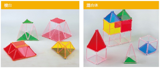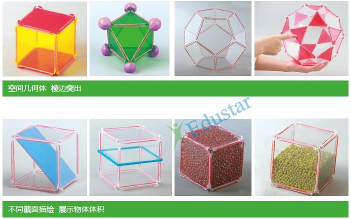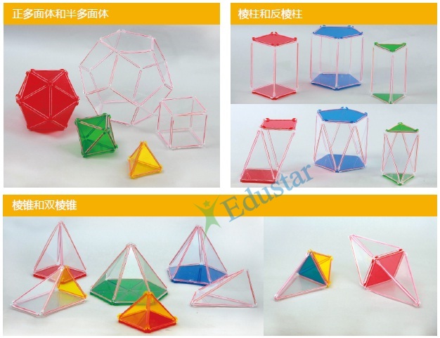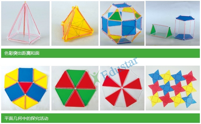 搭建套裝內含286塊標準化組件,其中等邊三角形100片、等腰三角形60片、正方形60片、長方形30片、五邊形36片,橡皮筋600根。套裝可以構建起正多面體、棱柱和反棱柱、棱錐和雙棱錐、棱臺以及組合體等多種立體幾何體模型,是一套獨一無二且極具價值的學習工具,可以最大限度激發學生的創造性,幫助學生建立空間意識,培養學生的空間想象力,達到教學目標。