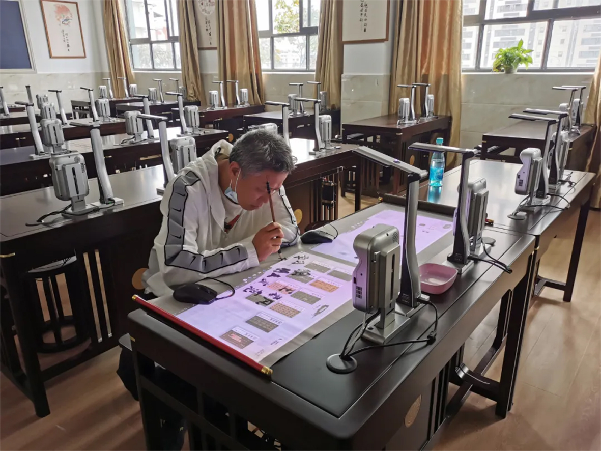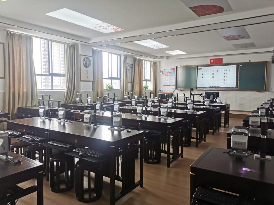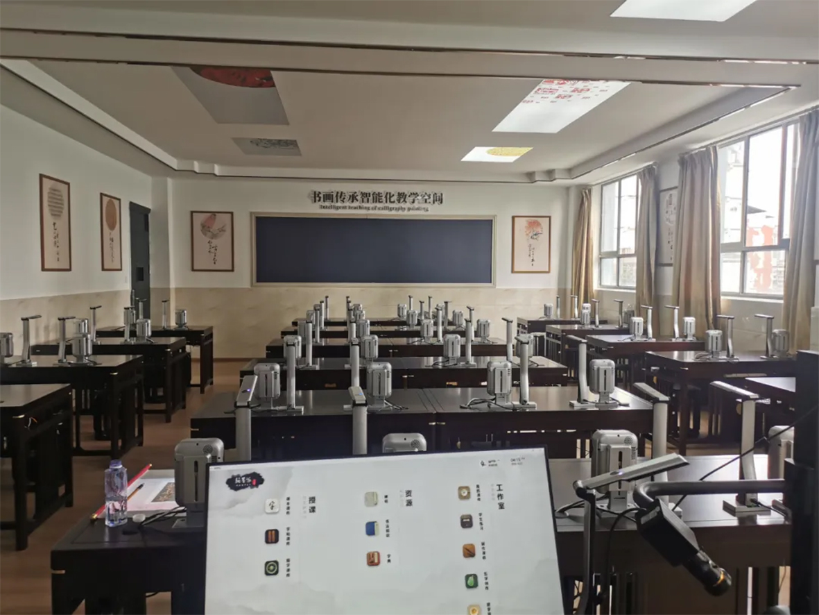 在羿飛翰墨派云書法教室中,一排排仿古桌椅將時間帶回到遙遠的古代學堂,桌面上一個個“金屬匣子”則彰顯著現代科技發展。在科技與傳統的碰撞融合中,將書法教育深植于課堂之中。