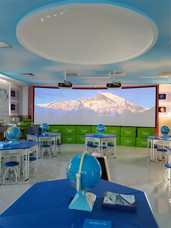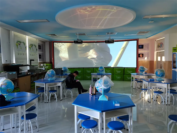 環(huán)幕示教系統(tǒng)位于教室后方,專用于地理視頻資源的播放。巨大的屏幕帶來震撼的視覺沖擊,直觀地展示事物發(fā)展的動(dòng)態(tài)過程,讓課程內(nèi)容變得更生動(dòng)有趣。視頻課件對(duì)課程的導(dǎo)入、過渡作用,使課程進(jìn)行得更自然順暢。