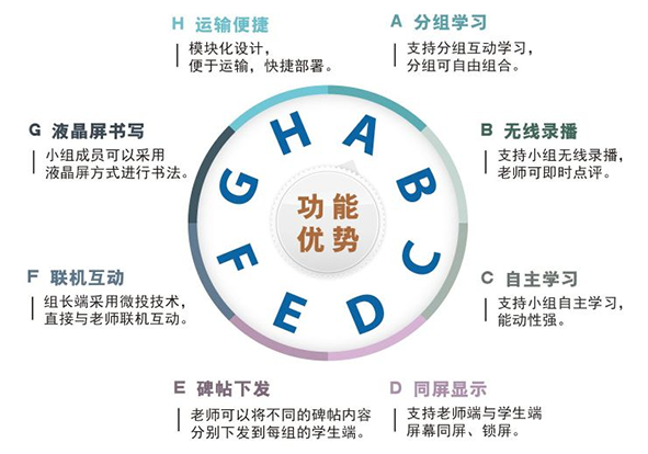 分組教學系統支持自由分組互動學習,教師可以將全班同學獨立分成多個學習小組,下發不同的學習內容及隨堂作業,以適應不同學習程度的同學的學習需求。組長可直接與老師聯機互動,小組內部也可開展自主學習,能動性極強。學生在分組學習過程中互相切磋,彼此交流學習經驗,提高學習興趣與效率。