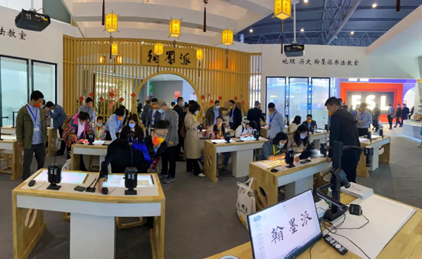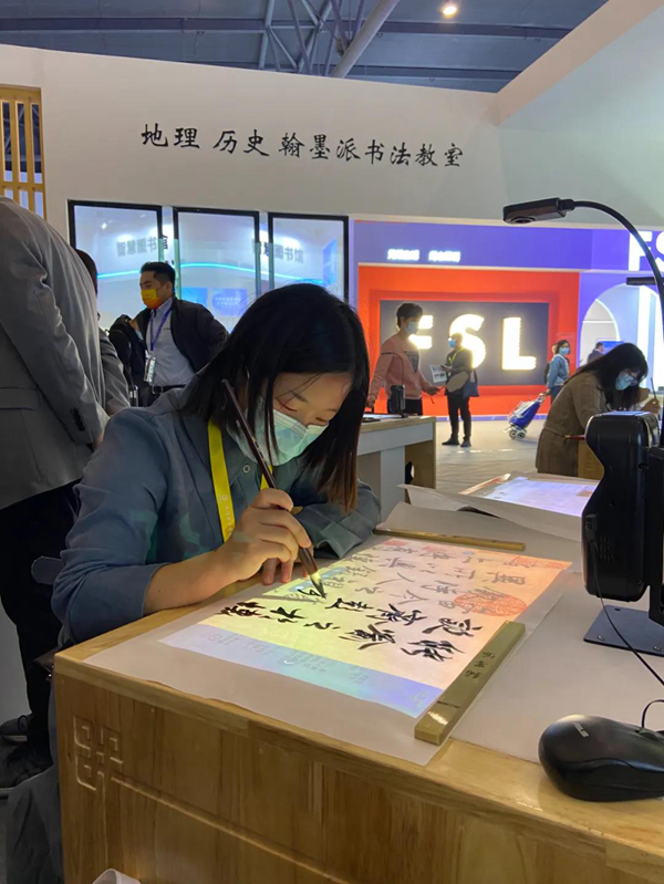 翰墨派云書法教室遵循教育部《中小學書法教育指導綱要》,是集數字化教育技術最新成果之大成,為學校打造新一代互動體驗書法教室。翰墨派強勢來襲,一改古典美的風范,本次亮相新中式建筑風格。搭配小橋流水人家,儼然成為成都展的網紅展位,吸引眾多美女賓客打卡臨摹。