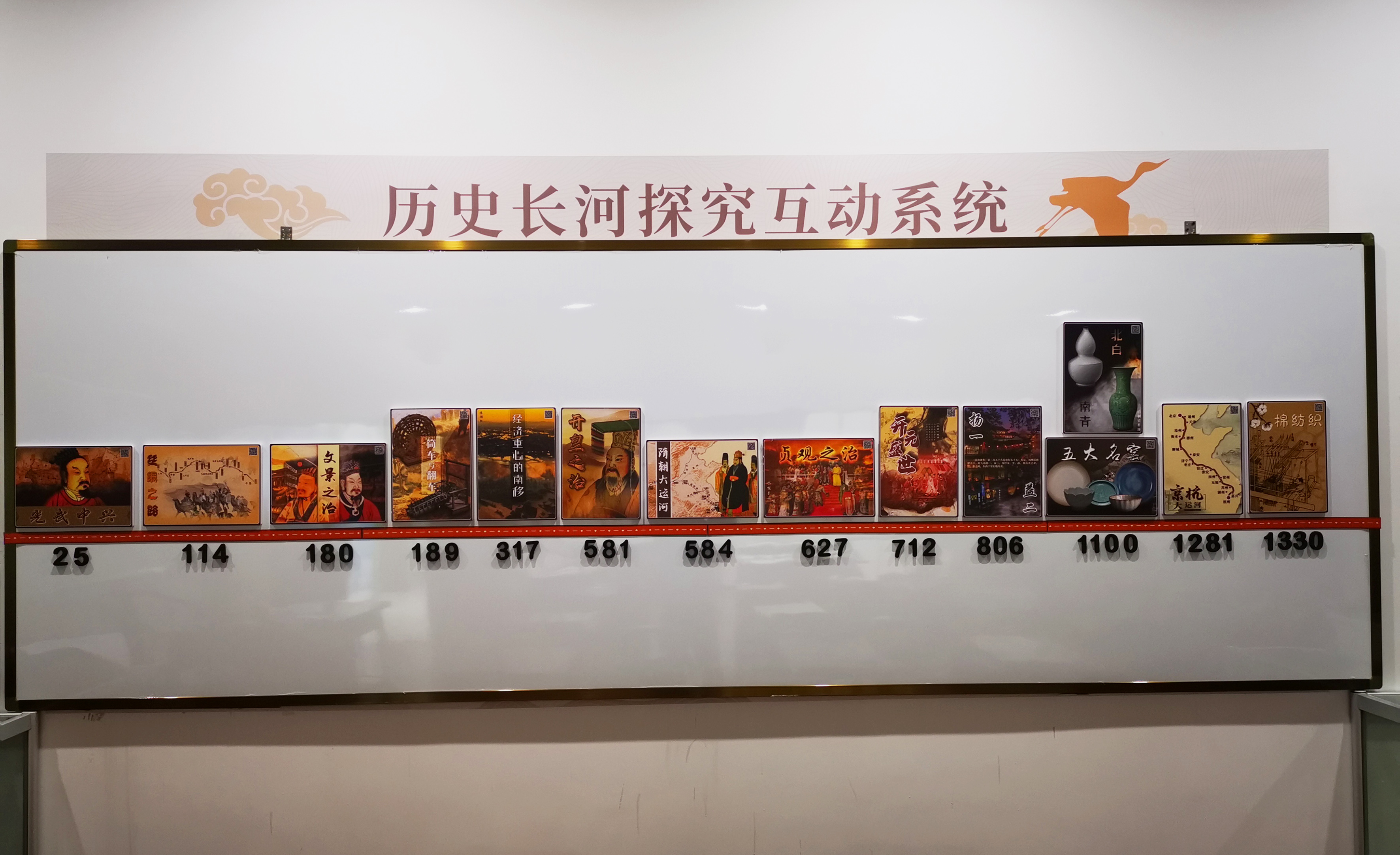 歷史長河探究互動系統系我司自主研發的歷史教學輔助系統,其篩選出中國與世界萬年歷史長河中最重要的數百件歷史事件,并將相關圖片、文字、音頻、視頻等數字資源上傳至云端服務器,師生可通過對二維碼進行掃描,從而提取其中所蘊含的可視化信息,進而通過活動板墻的形式予以展示。探究系統能夠協助教師進行歷史教學,幫助學生梳理歷史脈絡,從而達到并完成簡潔高效、活潑明晰的歷史教學任務。