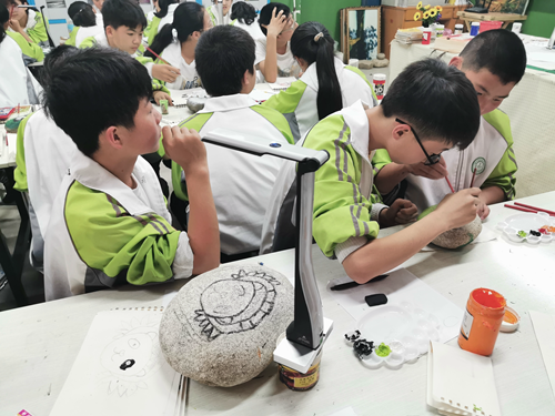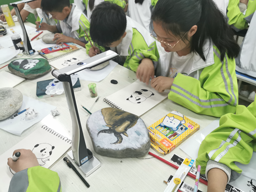 在熊貓石頭畫美術(shù)課上,師生們正在使用吉星捐贈(zèng)的未來(lái)智慧美術(shù)全互動(dòng)系統(tǒng)進(jìn)行美術(shù)教學(xué)。