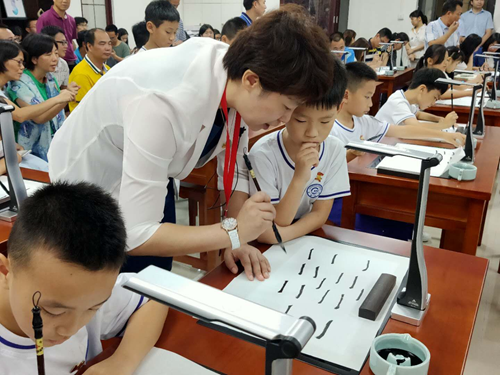這堂別具特色的書法課,將古典書法與現(xiàn)代科技有機(jī)結(jié)合起來。比起傳統(tǒng)書法課堂的單向教學(xué),運(yùn)用吉星智慧書法課堂的教學(xué)方式做到了“能看、能評(píng)”,簡(jiǎn)單高效,打造了一種能夠提高教師書法教學(xué)效率的全新模式,語文老師也可以上書法課。