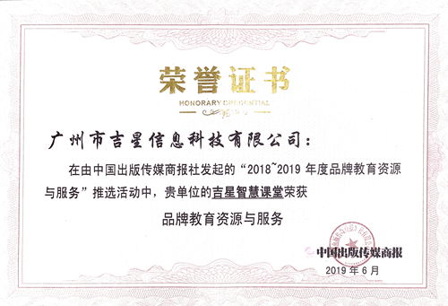 由中國(guó)出版?zhèn)髅缴虉?bào)社發(fā)起的“2018~2019年度品牌教育資源與服務(wù)”推選活動(dòng)中,吉星智慧課堂榮獲“品牌教育資源與服務(wù)”榮譽(yù)稱號(hào)。