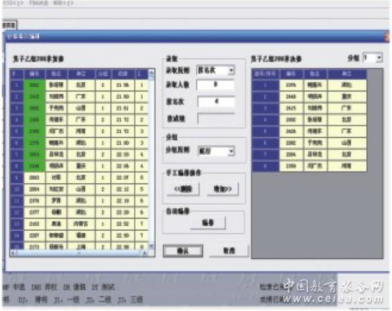 比賽過程的信息處理包括后續(xù)賽次錄取編排、各種統(tǒng)計信息、各種文書文檔等,提供自動編排與手工調(diào)整兩種方式,在此基礎(chǔ)上生成分場秩序冊;針對不同項目提供大量統(tǒng)計信息,如:全能項目積分、運動員等級、破紀錄信息等,一旦比賽成績傳送完成,上述信息立即自動生成,個別信息(如破紀錄)還將自動提示。